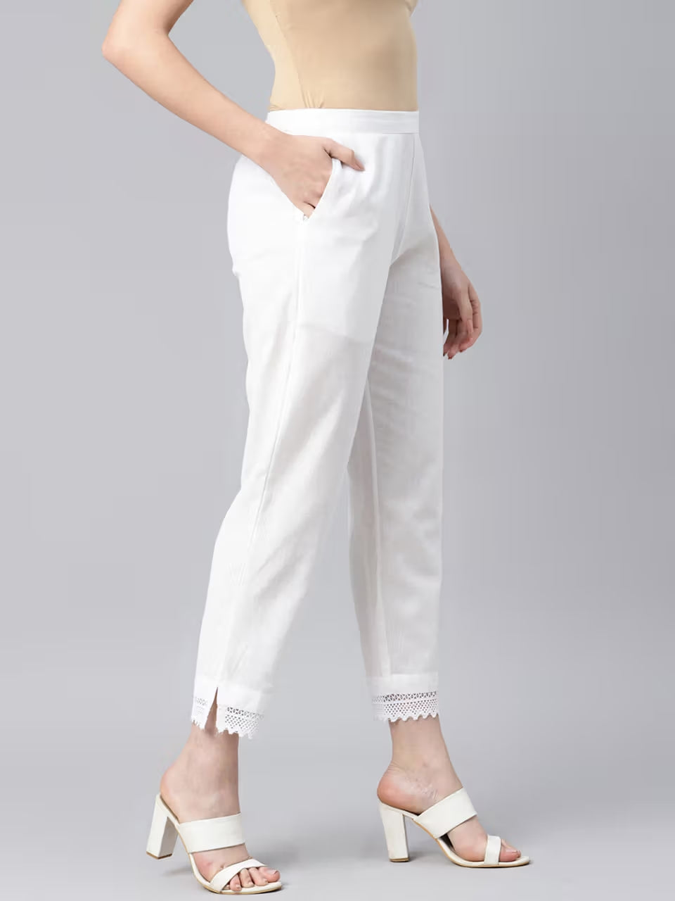 Crafted with a perfect blend of comfort and style, this straight solid pant from Piroh is a must-have in your wardrobe. The pant features a partially elasticated waistband for a comfortable fit, slits on the hem with lace detail for added elegance, and a convenient side pocket. Made from high-quality cotton, this pant is not only stylish but also incredibly comfortable to wear.